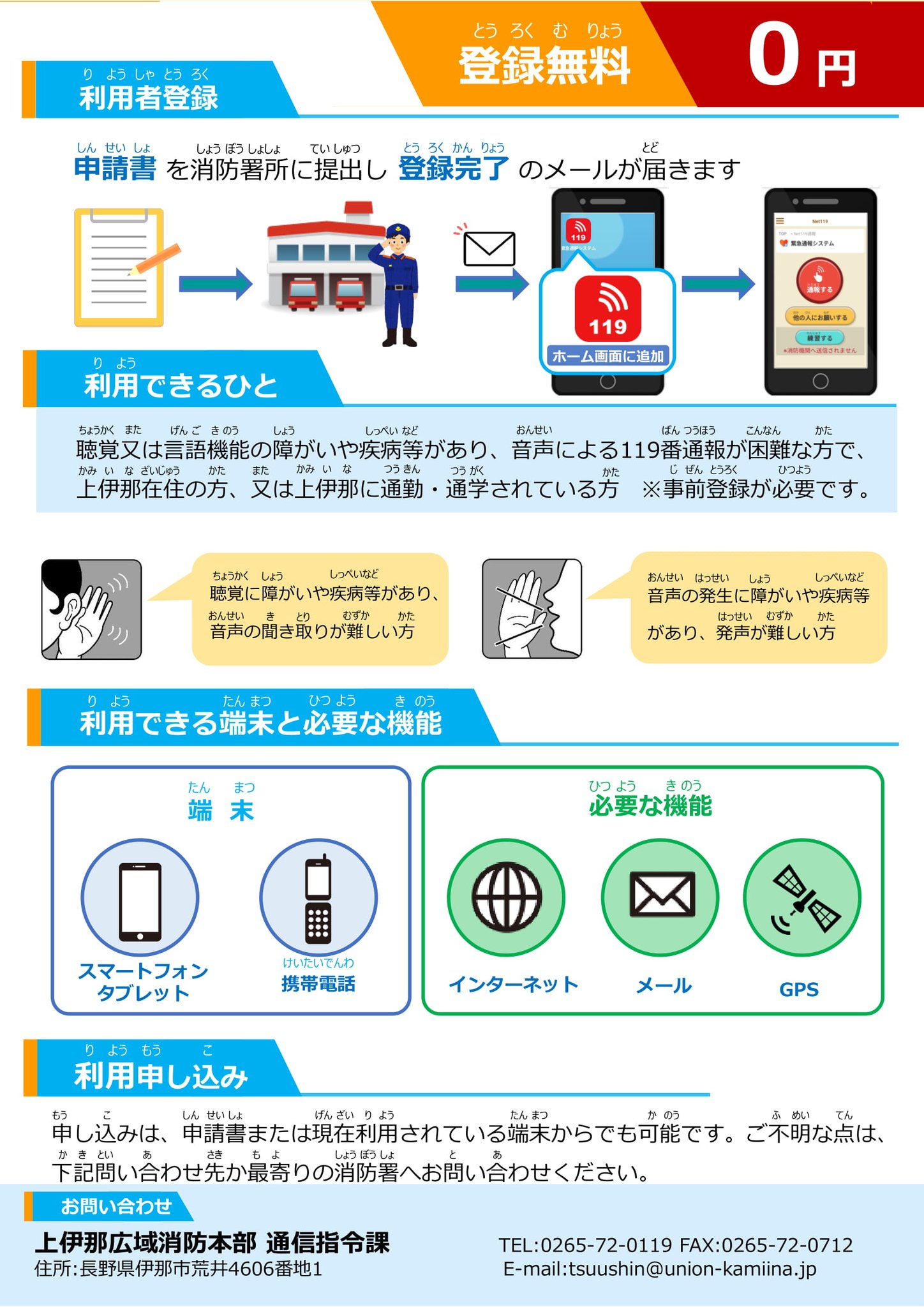 Webでの登録を希望される方は、お手数ですが上伊那広域消防本部通信指令課(tsuushin@union-kamiina.jp)か最寄りの消防署までお問い合わせください。