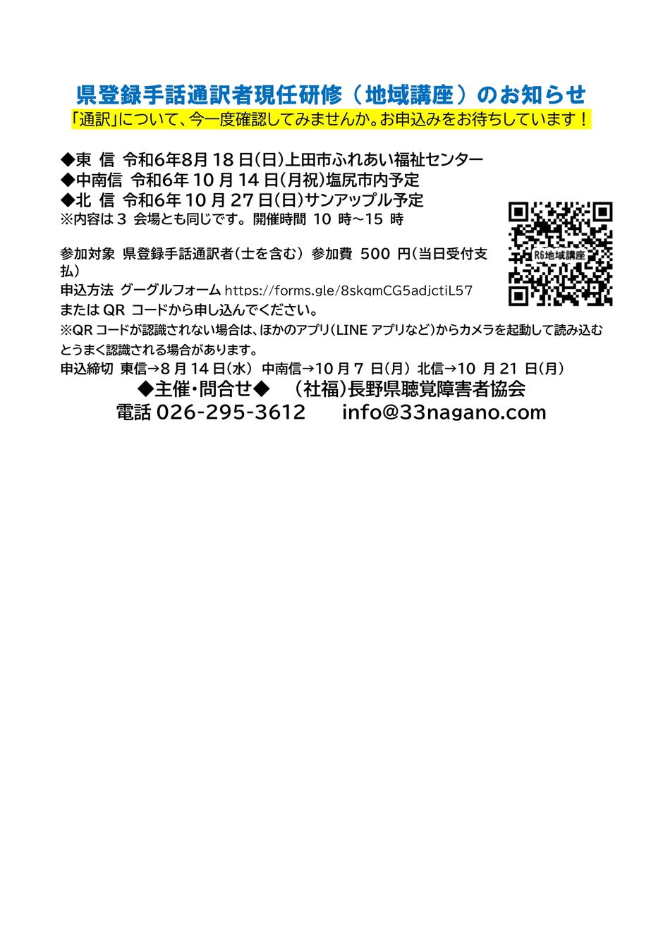 講座・イベント · 2024/07/04 【終了しました】県登録手話通訳者現任研修(地域講座)のお知らせ グーグルフォームの申込みはこちらから⇐ HP用原稿(地域講座).pdf PDFファイル 236.1 KB ダウンロード tagPlaceholderカテゴリ: