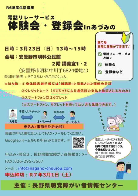 講座・イベント · 2025/01/10 【終了しました】R6年度生活講座「電話リレーサービス体験会・登録会inあづみの」 申込み延長しました(締切日:3月20日(木) 電話リレーサービス体験会・登録会inあづみの申込サイト⇐こちらをクリック 2025年 電話リレーサービスinあづみの.pdf PDFファイル 785.2 KB ダウンロード tagPlaceholderカテゴリ: