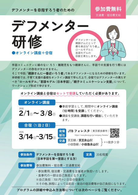 お知らせ · 2025/12/19 【国リハ手話療育班事務局から】デフメンターを目指すろう者のためのデフメンター研修のご案内 デフメンターを目指すろう者のためのデフメンター研修申込フォーム⇐こちらをクリック デフメンター研修チラシ(260314-15).pdf PDFファイル 998.5 KB ダウンロード tagPlaceholderカテゴリ:
